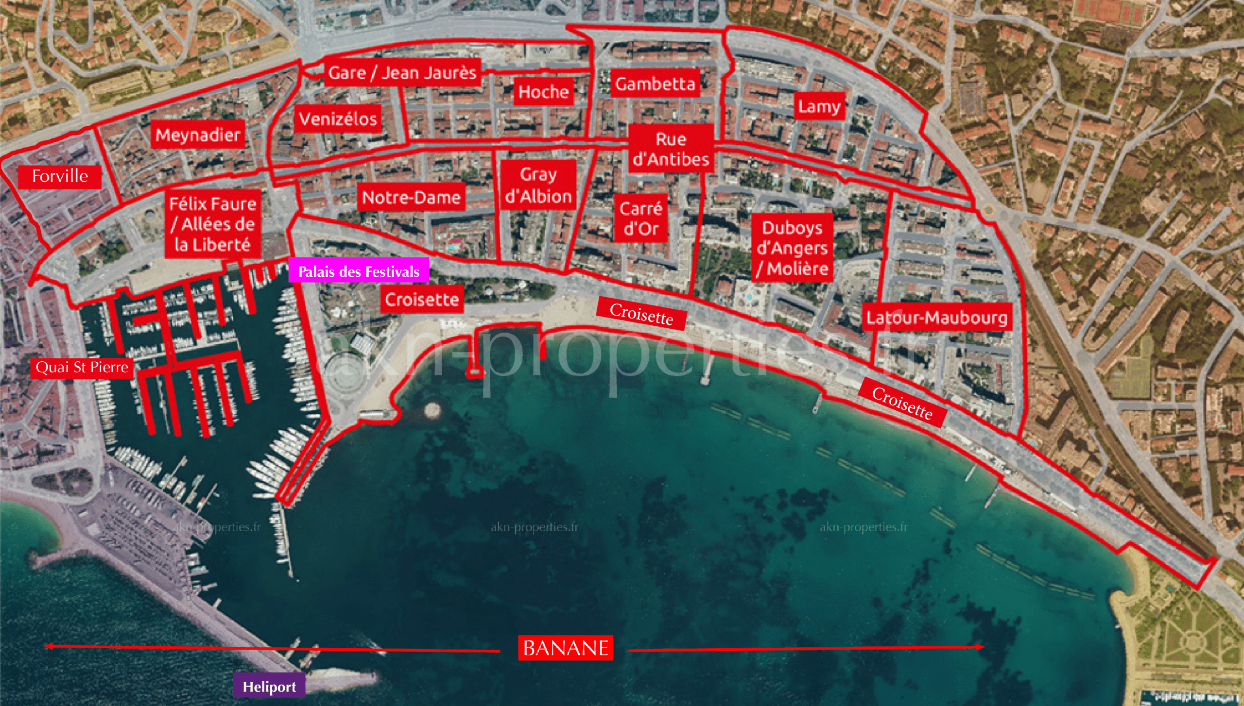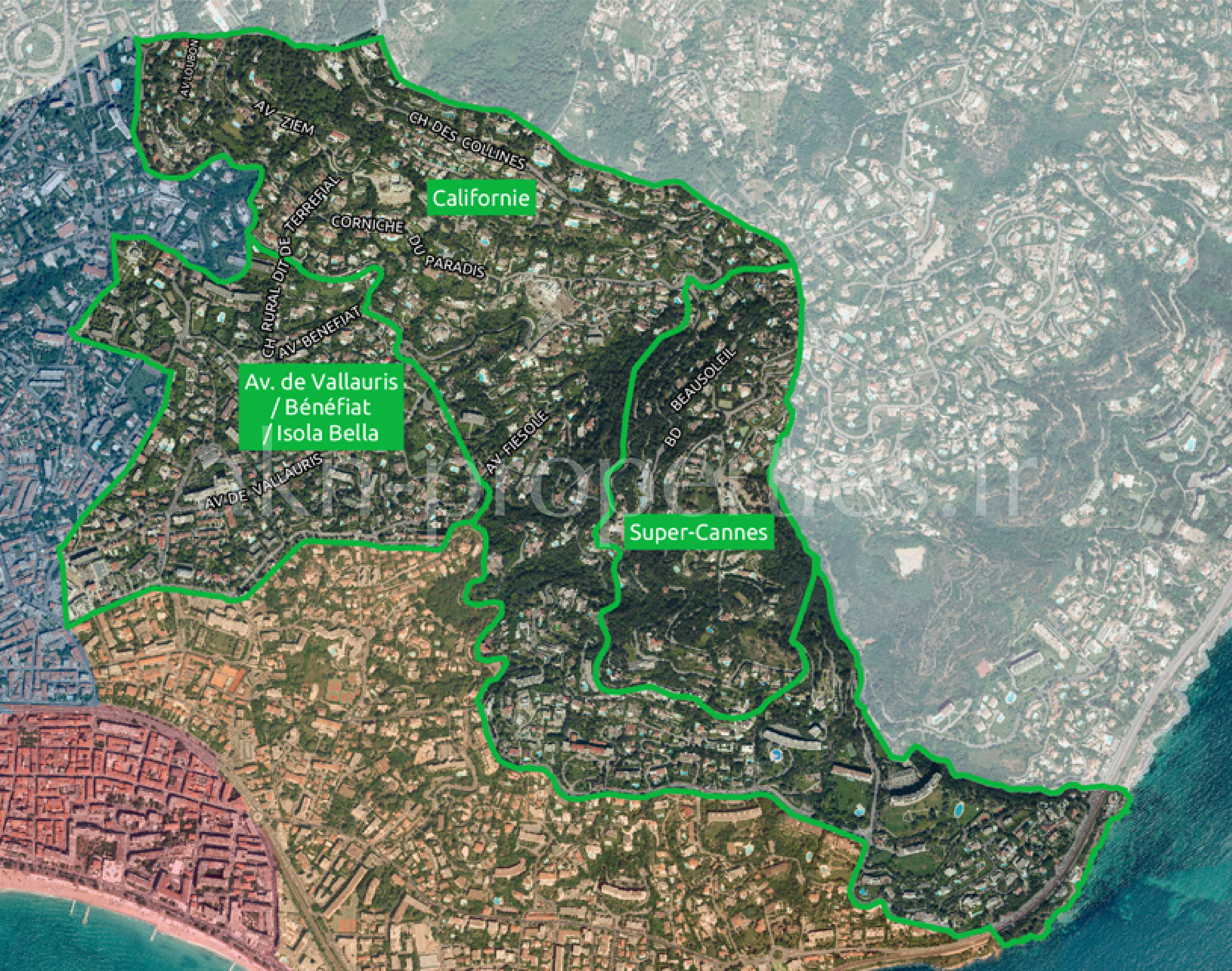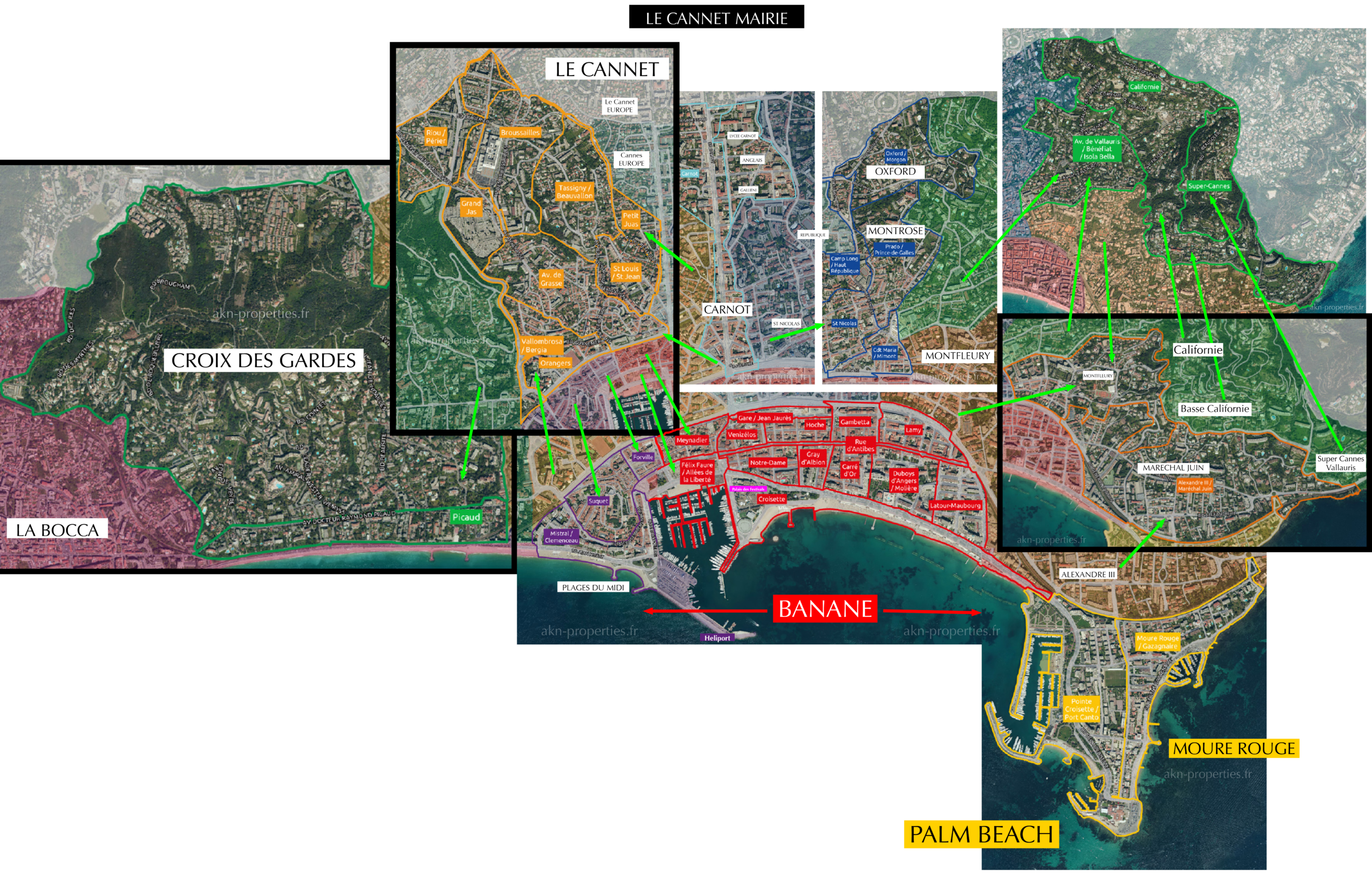 Map of Cannes districts click on each map to enlarge Map of Cannes with all districts Californie Basse Californie Centre Ville – Banane Pointe Croisette – Palm Beach Petit Juas – Tassigny Suquet – Forville Carnot – Anglais – Europe Croix des Gardes St Nicolas – Oxford