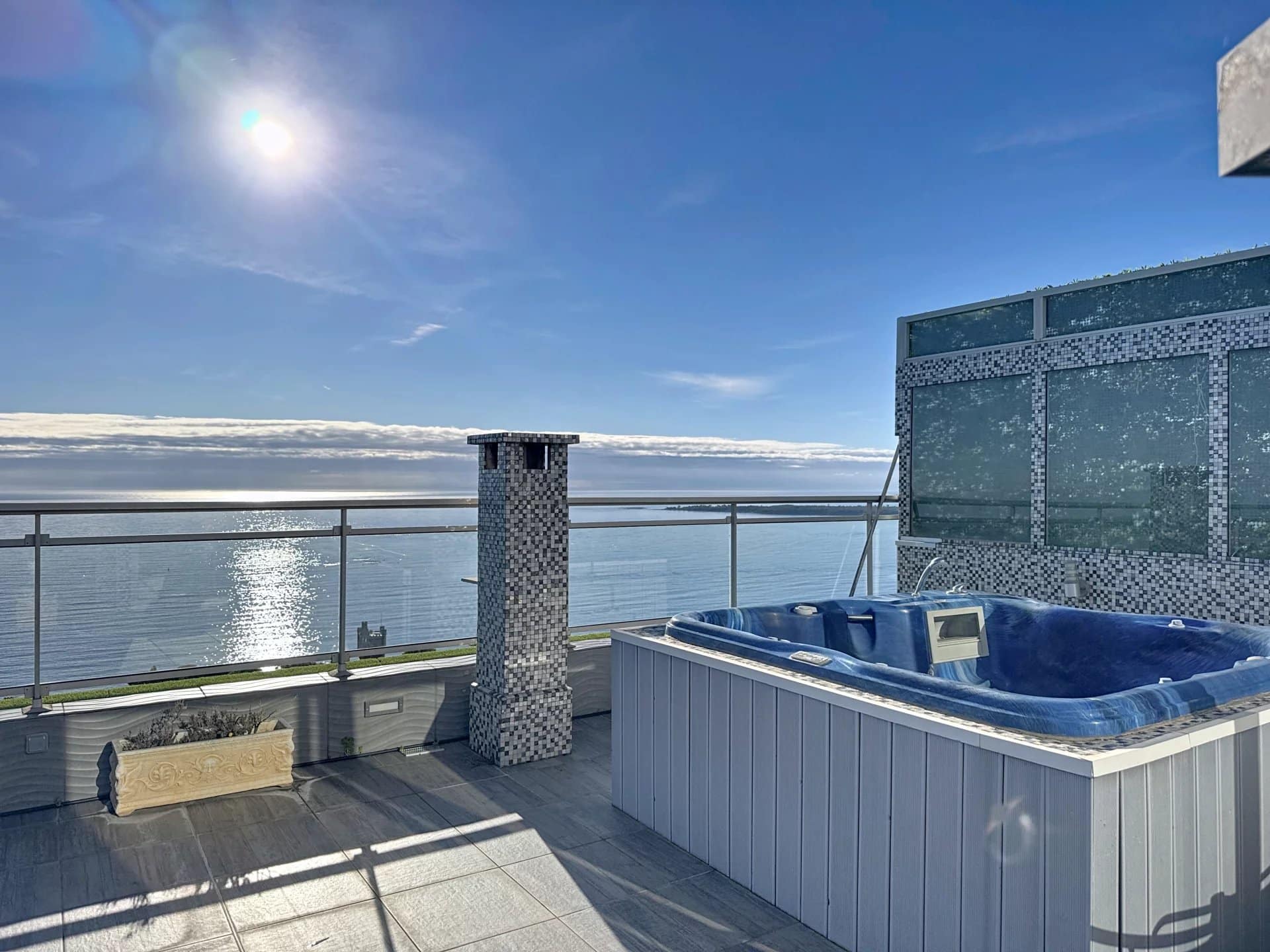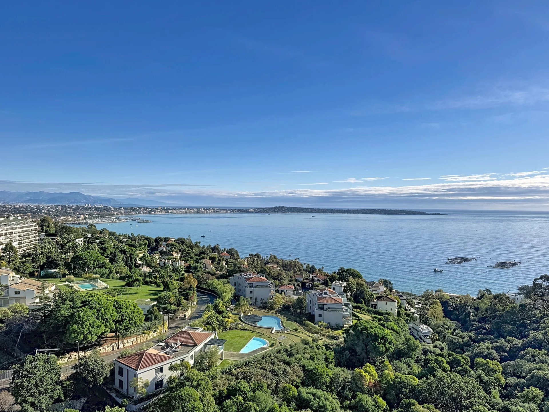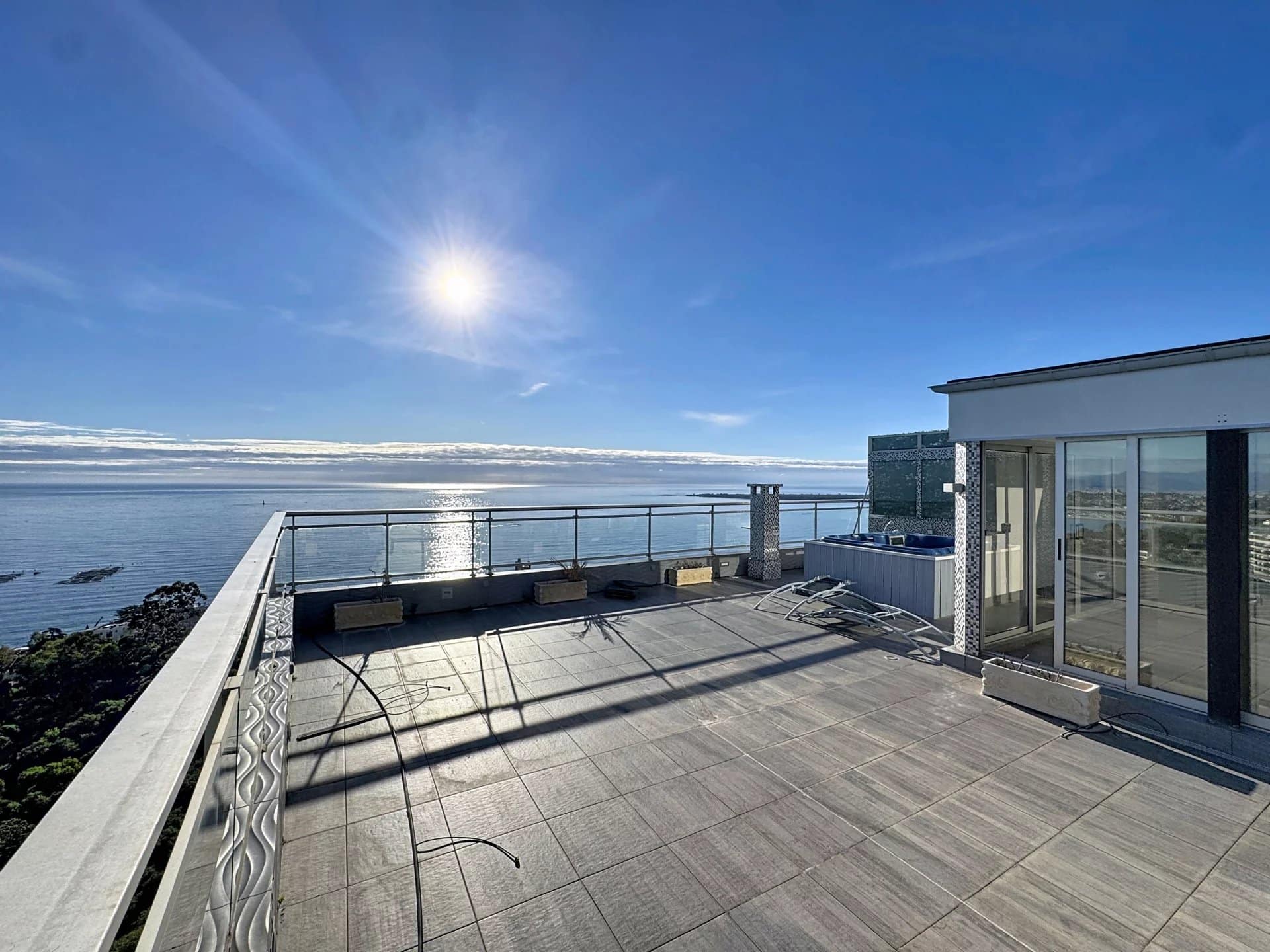 The apartment enjoys open angles, a 27 sqm terrace filled with natural light, and a 91 sqm private rooftop with jacuzzi and a breathtaking panoramic sea view stretching from Cap d’Antibes to the Esterel hills.