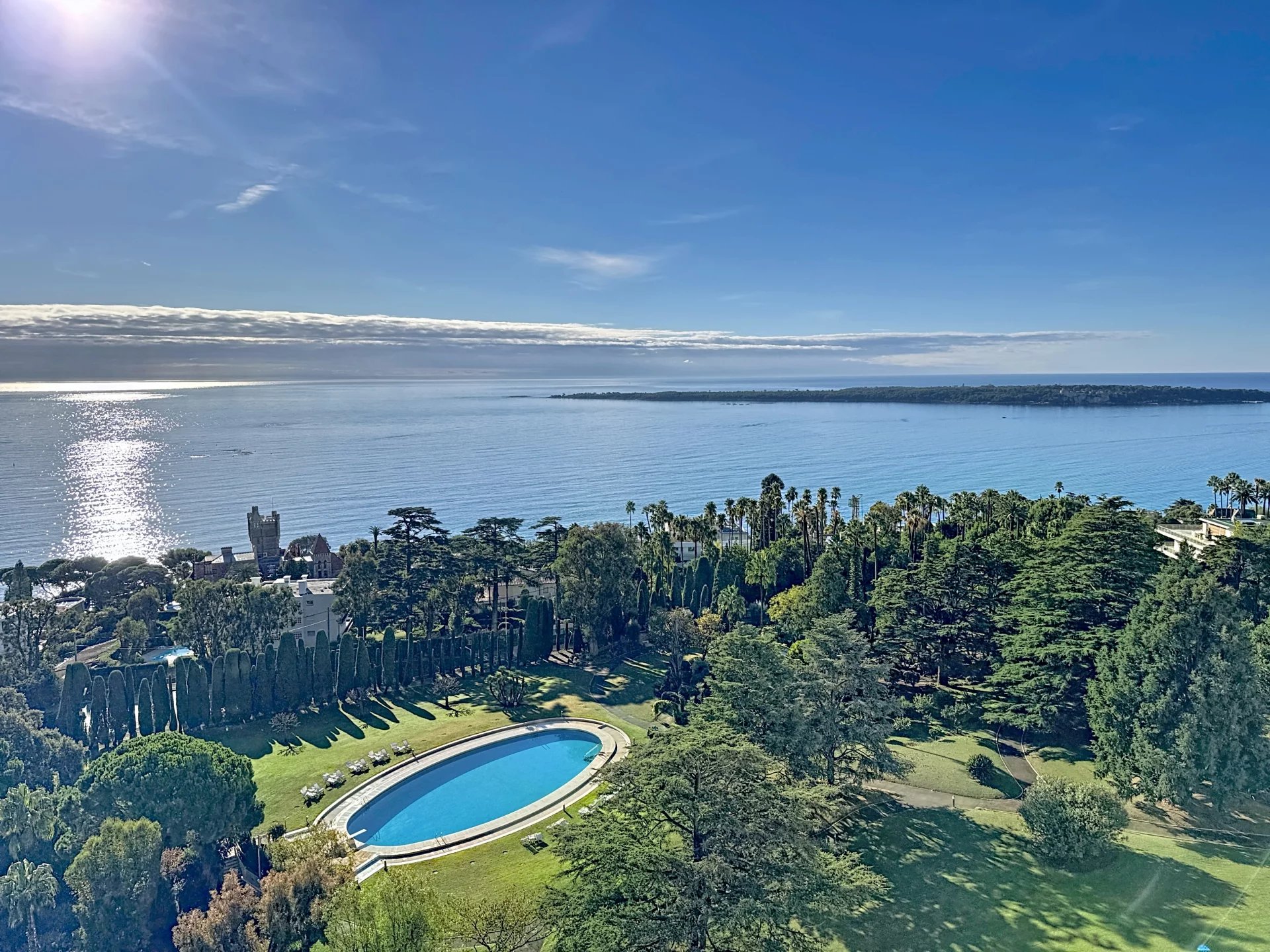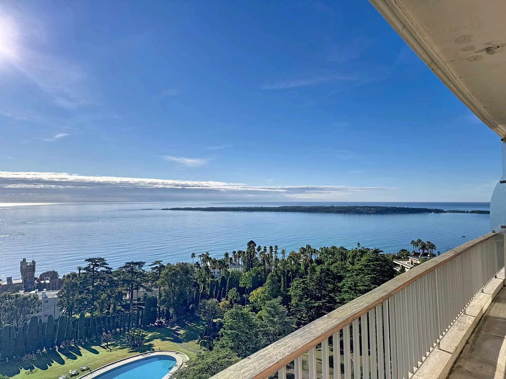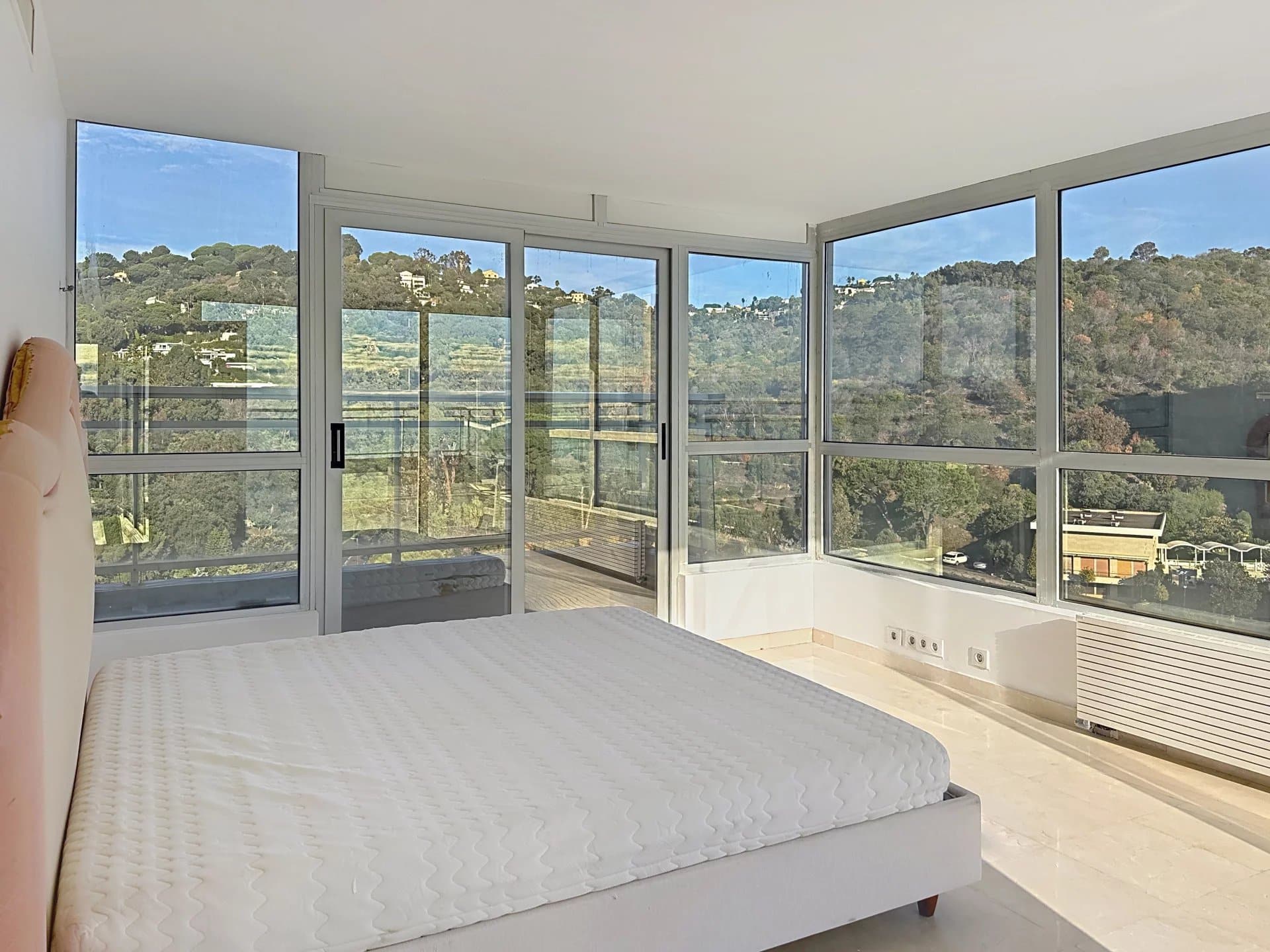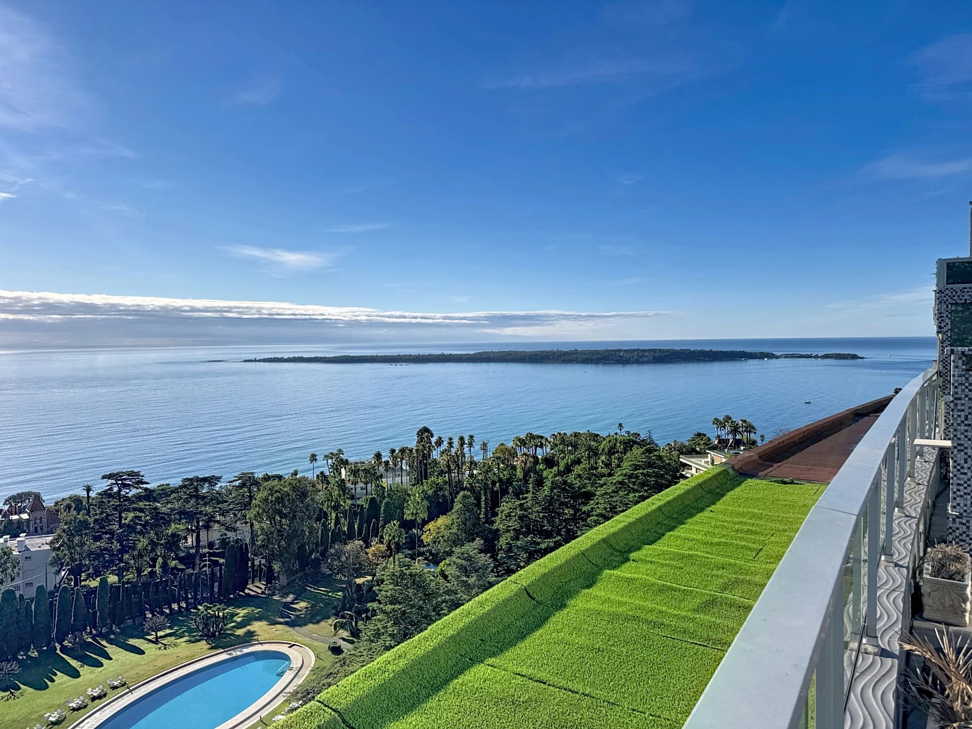 The apartment enjoys open angles, a 27 sqm terrace filled with natural light, and a 91 sqm private rooftop with jacuzzi and a breathtaking panoramic sea view stretching from Cap d’Antibes to the Esterel hills.
