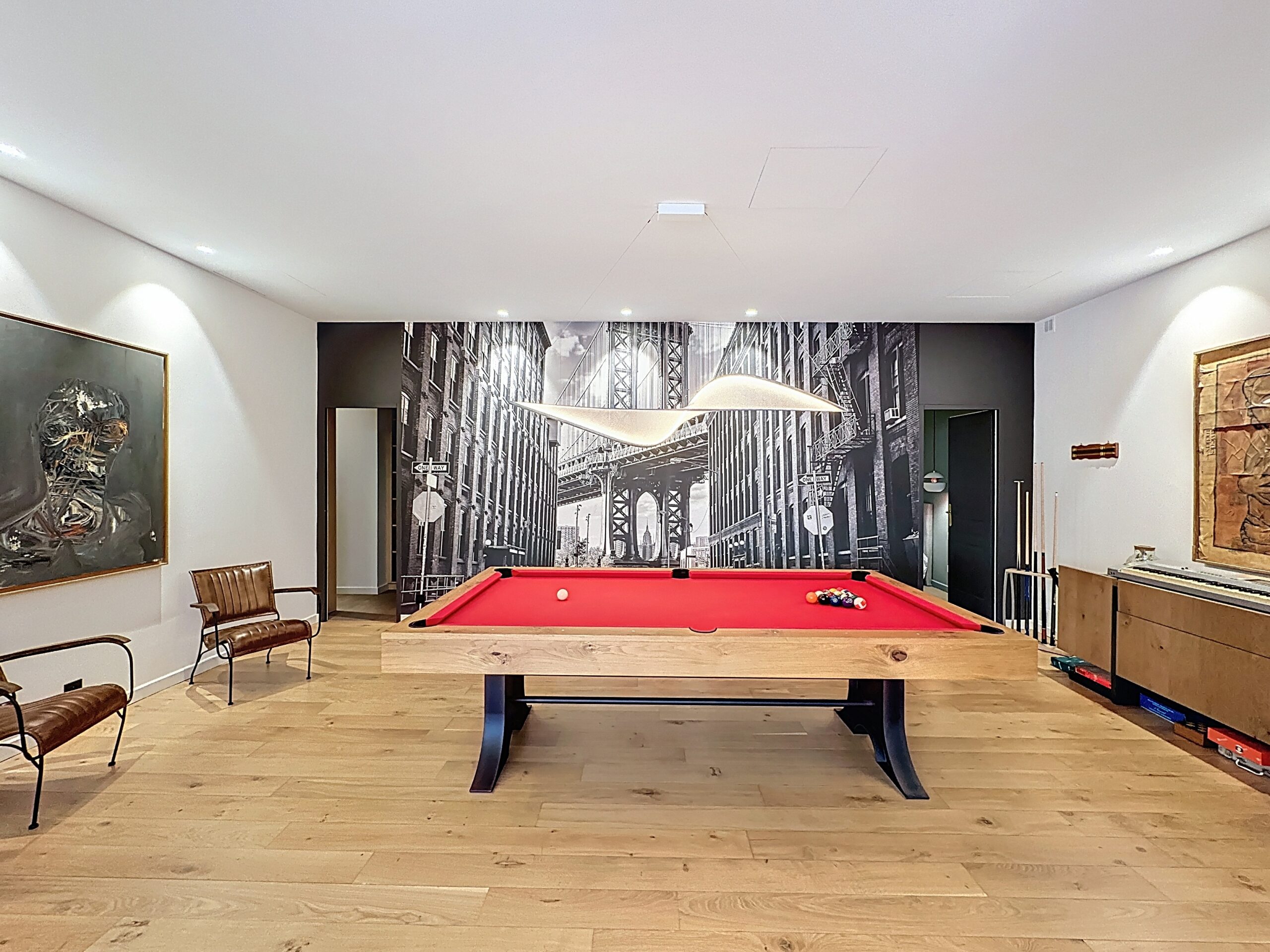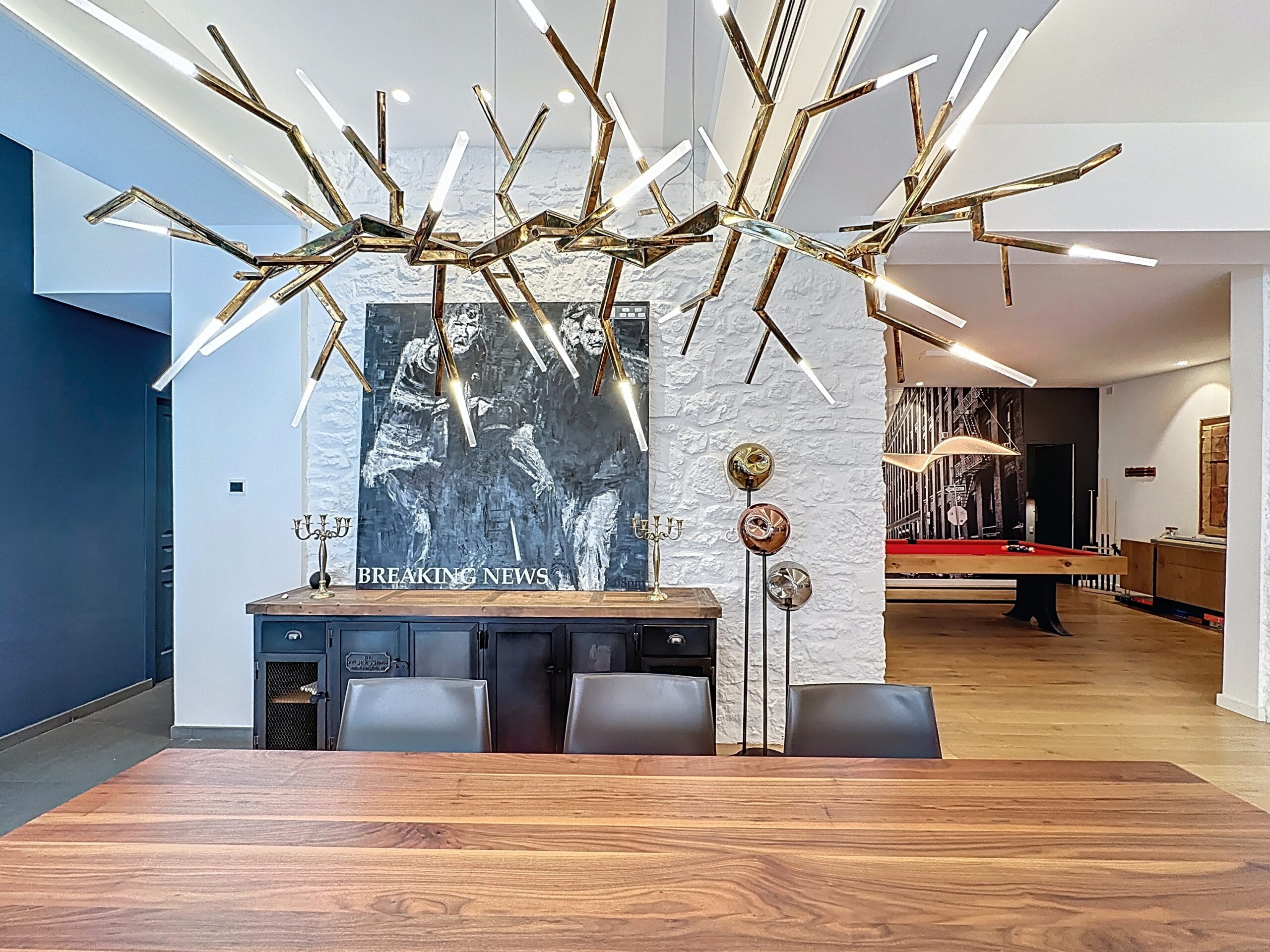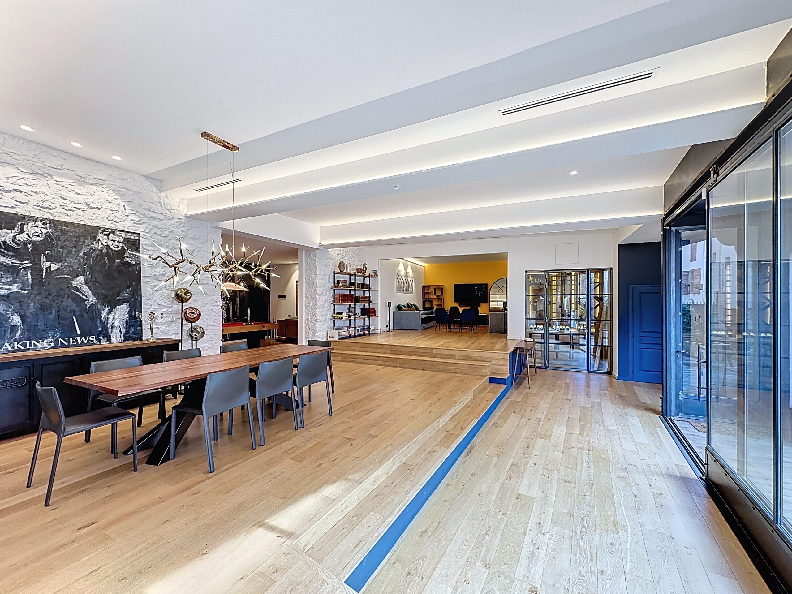 The interior features a vast living area with remarkable proportions, including an open-plan kitchen, a convivial dining room, a refined living room, and a billiards area, ideal for entertaining and relaxing.