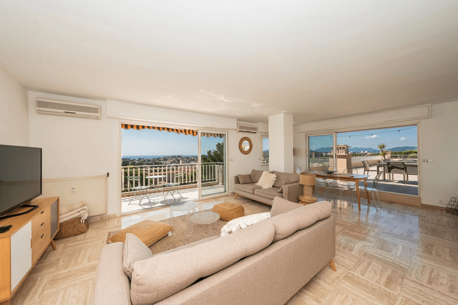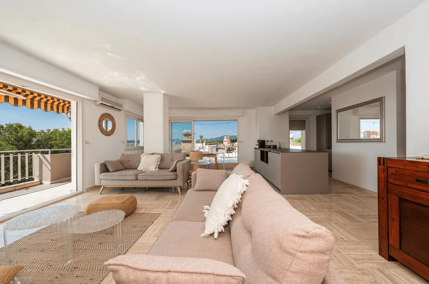 Occupying the 4th and top floor of a recently renovated, secure residence, this rare property offers 90 sqm of living space and opens onto an extraordinary 280 sqm rooftop terrace, boasting breathtaking views over the sea and surrounding mountains. Its south-facing exposure ensures abundant natural light throughout the day.