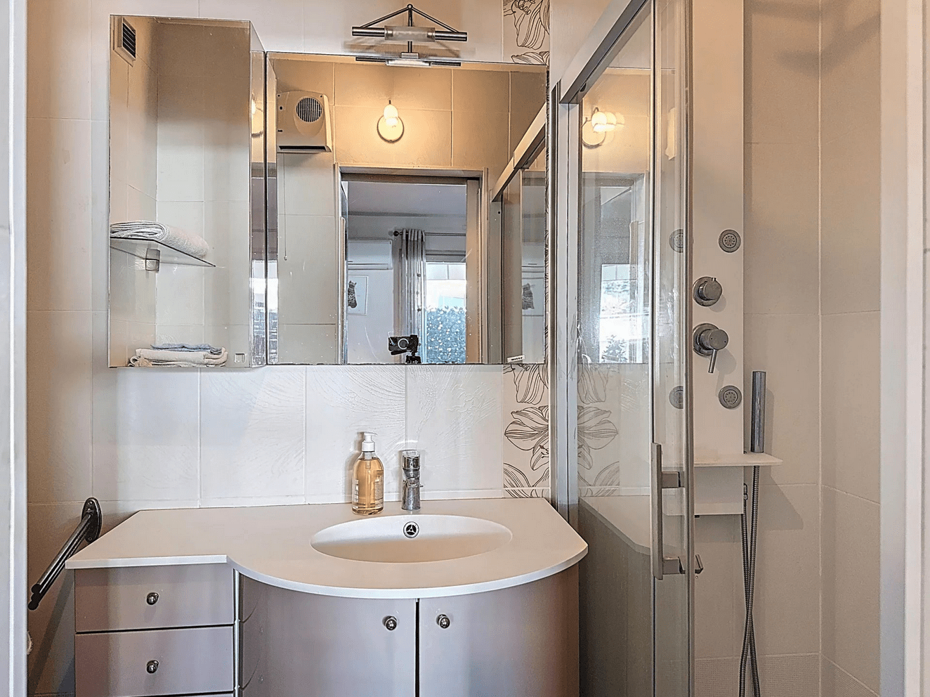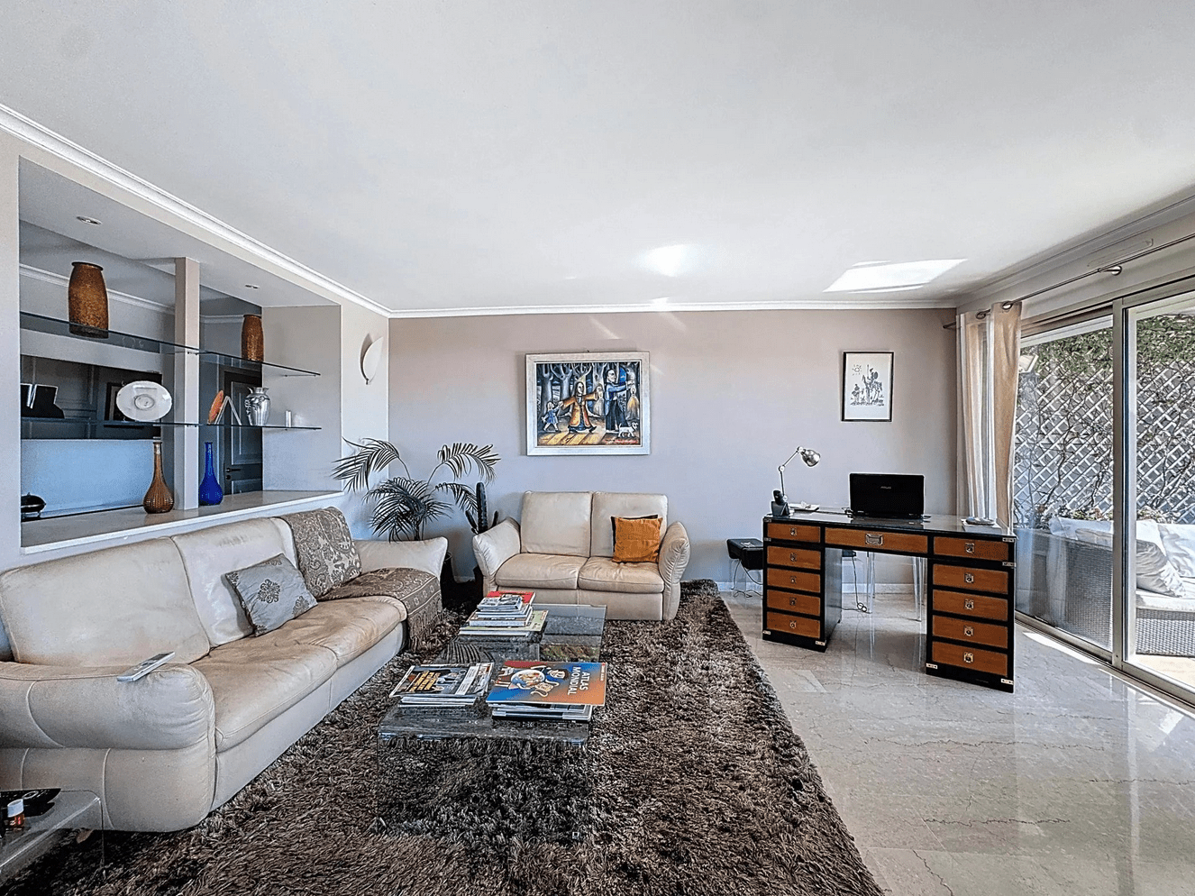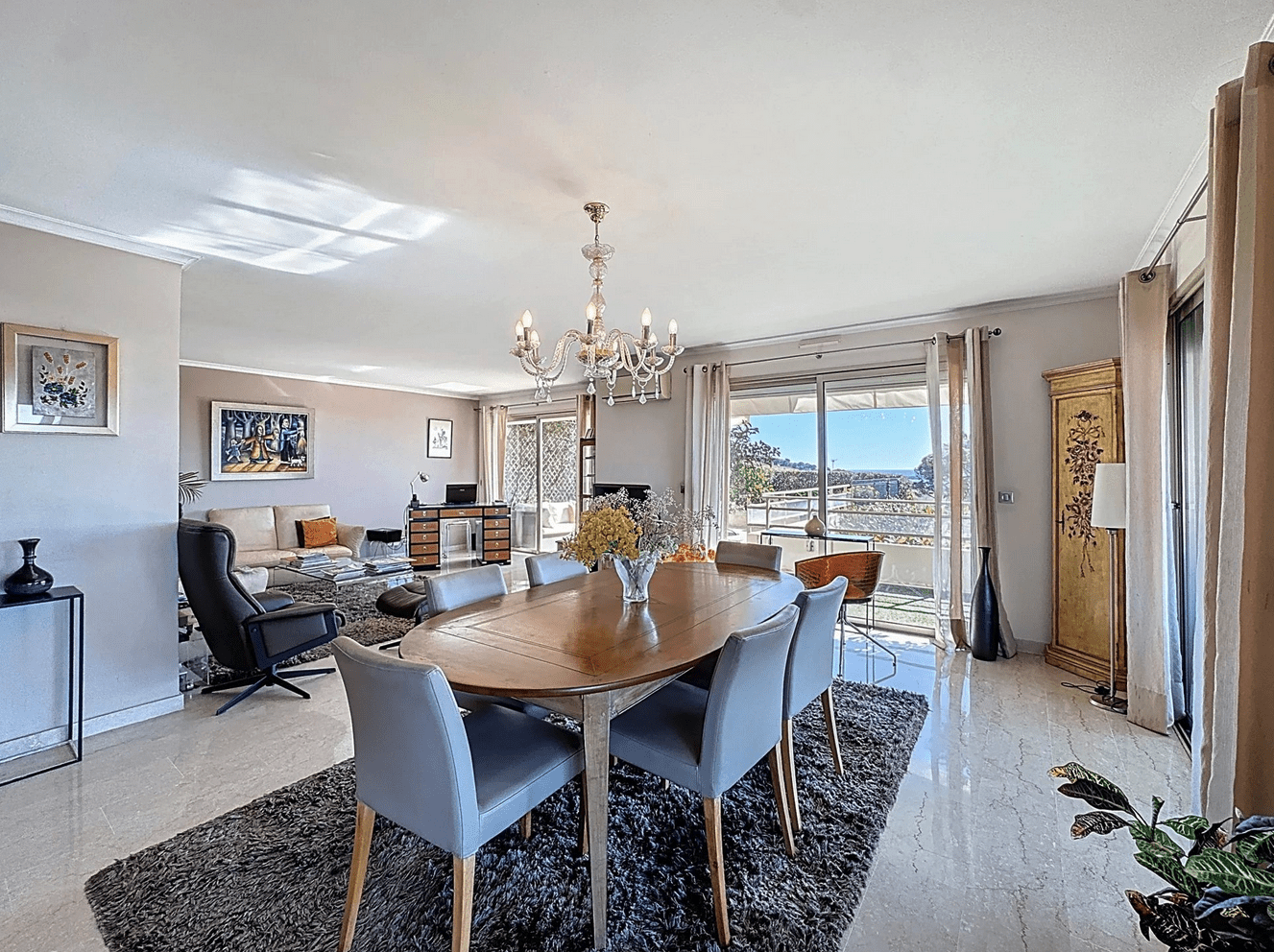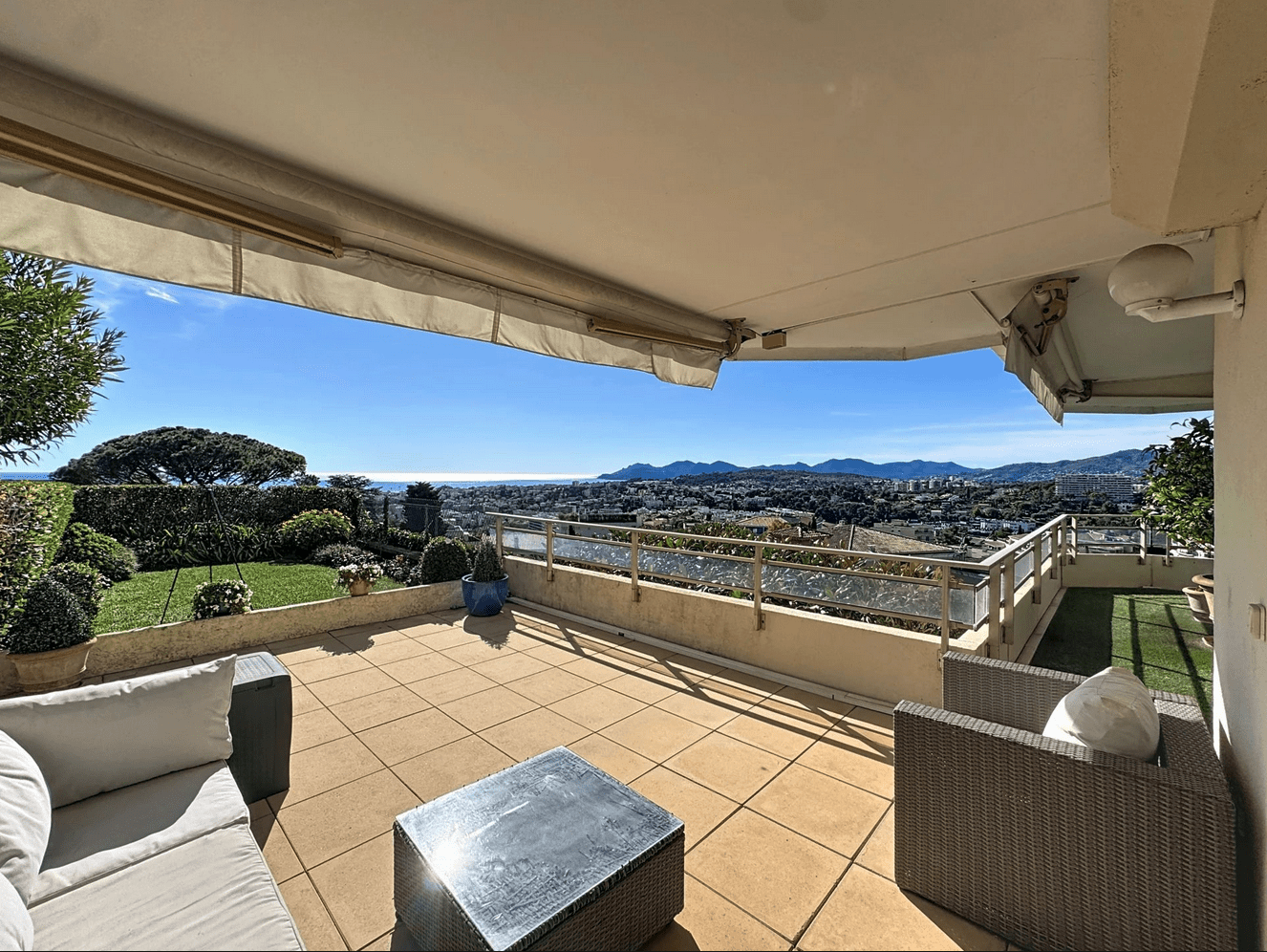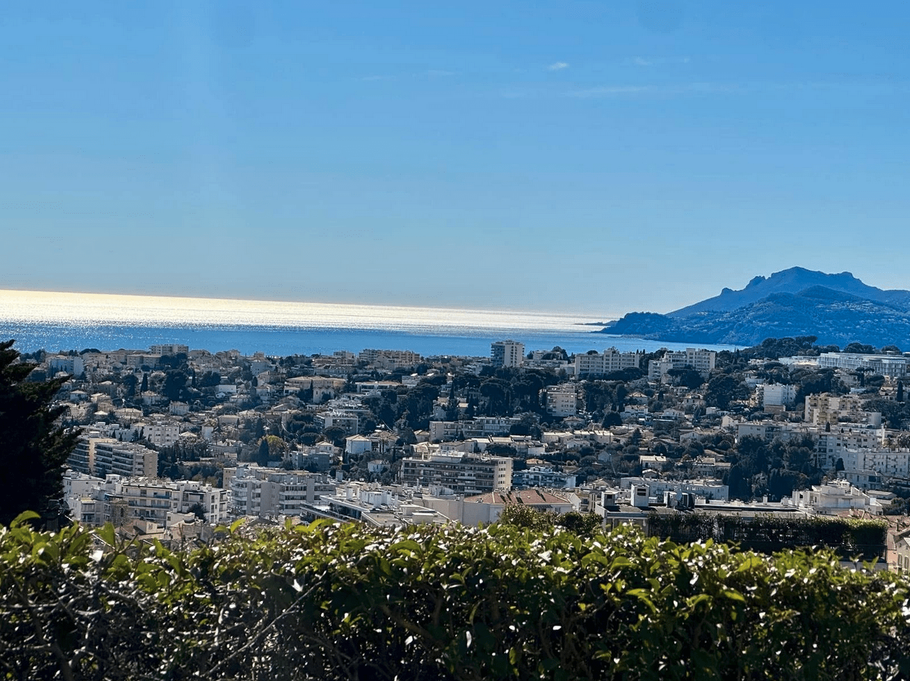 From the moment you step inside, the magic begins: a truly breathtaking panoramic sea view unfolds before you, stretching from the Lérins Islands to the dramatic hills of the Estérel mountains — a living masterpiece that evolves beautifully throughout the day.